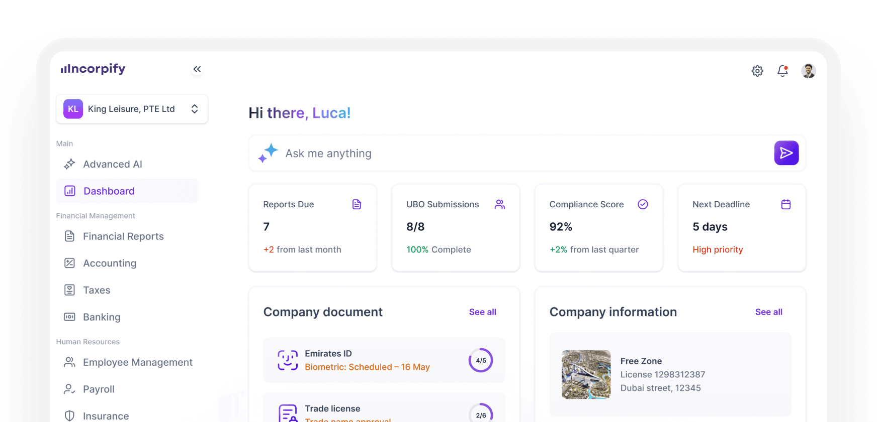 - Centralized Digital Dashboard – Track your company setup and progress in one place.